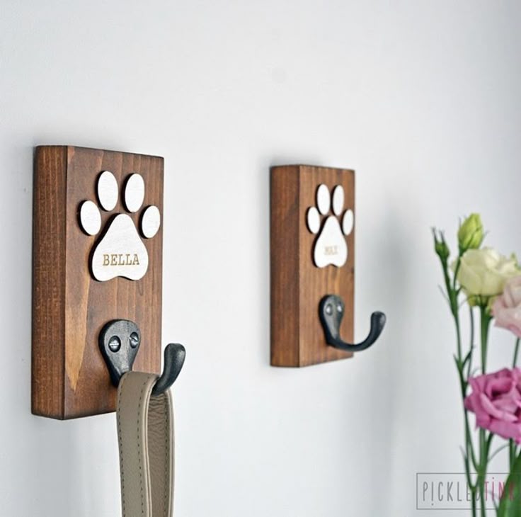 Handcrafted wooden leash holder featuring a custom pet name and paw design. Perfect for organizing leashes while adding charm to your home.